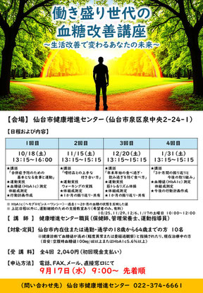 仙台市健康増進センターでは、血糖改善に向けた栄養指導や運動実技を含む全4回の講座を行います。HbA1c測定や体組成測定をして現状を把握し運動や食事の改善に一緒に取り組みましょう。